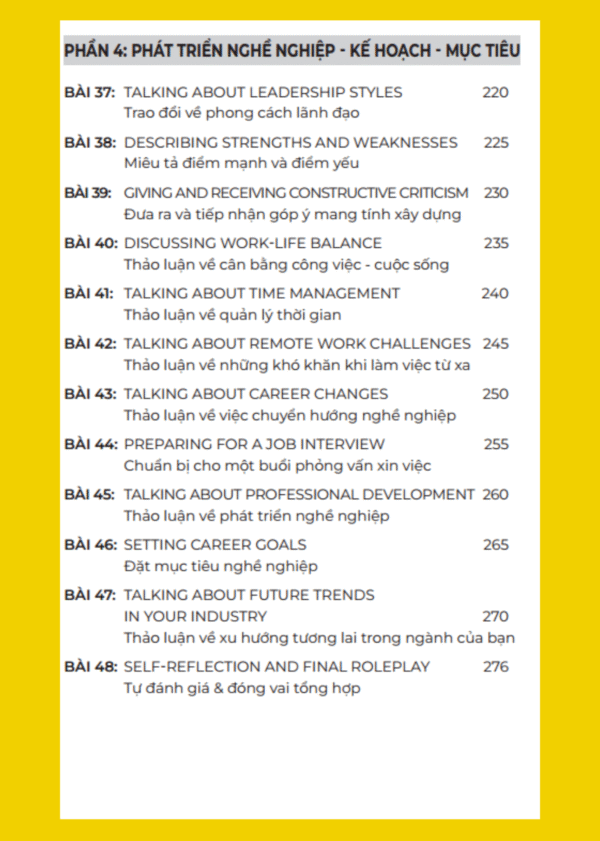Phần 4: Phát triển nghề nghiệp – Kế hoạch – Mục tiêu – thảo luận phong cách lãnh đạo, quản lý thời gian, cân bằng công việc – cuộc sống, chuẩn bị phỏng vấn, phát triển nghề nghiệp lâu dài.