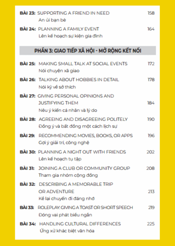 Giao tiếp xã hội & mở rộng kết nối: tham gia câu lạc bộ, lên kế hoạch tiệc tùng, bày tỏ ý kiến, đồng ý và phản đối lịch sự, ứng xử khác biệt văn hóa.