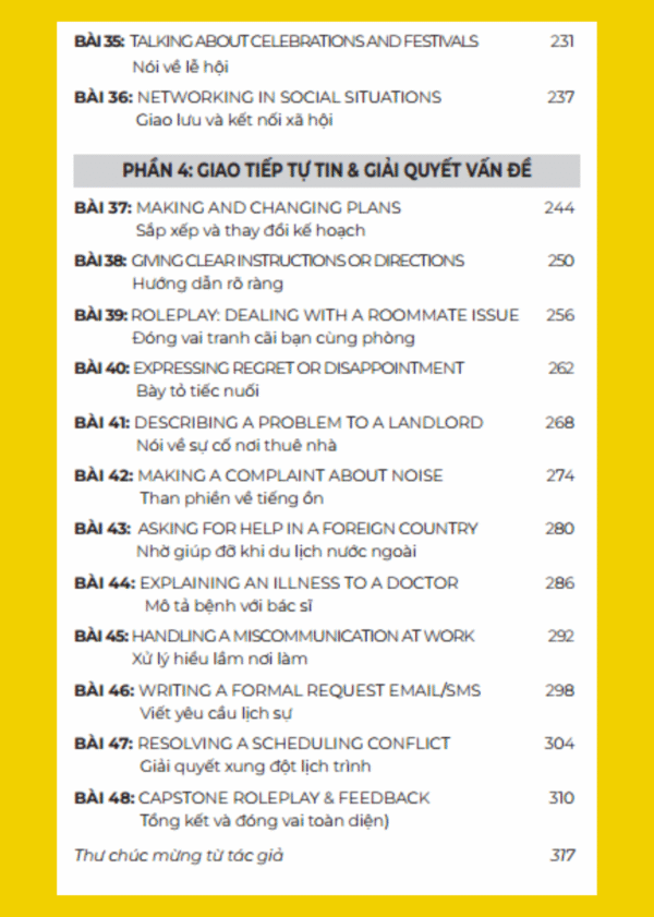 Giao tiếp tự tin & giải quyết vấn đề: sắp xếp kế hoạch, mô tả sự cố, than phiền tiếng ồn, mô tả bệnh với bác sĩ, xử lý hiểu lầm nơi công việc, và viết email chính thức.