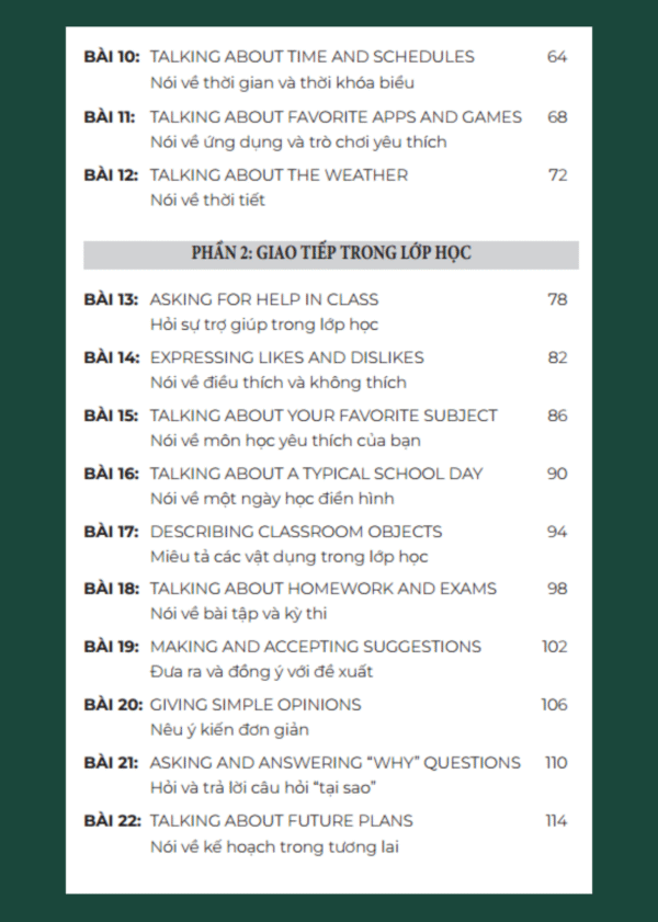 Giao tiếp trong lớp học: Hỏi sự giúp đỡ, nói về môn học yêu thích, trao đổi bài tập, bày tỏ ý kiến.