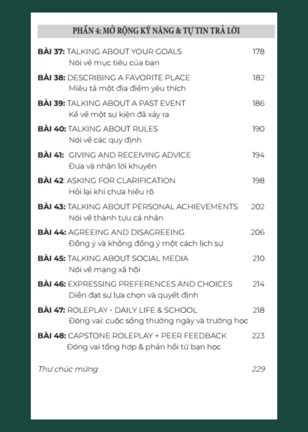 Mở rộng kỹ năng & tự tin trả lời: Kể về mục tiêu, sự kiện, thành tựu cá nhân, diễn đạt ý kiến đồng ý/không đồng ý, nói về mạng xã hội.