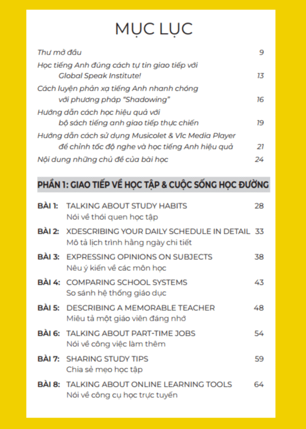 • Giao tiếp học tập & đời sống học đường: Nói về thói quen học tập, công việc làm thêm, giáo viên đáng nhớ, công cụ học online.