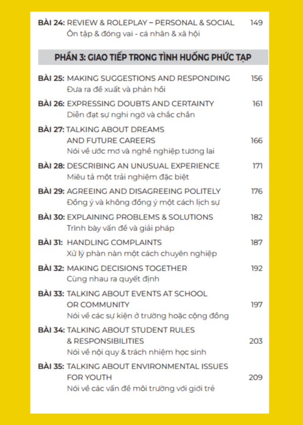 • Giao tiếp trong tình huống phức tạp: Thảo luận ước mơ nghề nghiệp, diễn đạt nghi ngờ – chắc chắn, trình bày vấn đề và giải pháp, xử lý phàn nàn, ra quyết định chung.