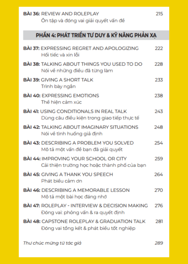 • Phát triển tư duy & kỹ năng phản xạ: Sử dụng câu điều kiện, nói về tình huống giả định, trình bày ngắn, phát biểu cảm ơn, mô tả một bài học đáng nhớ.
